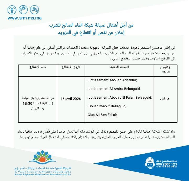 “SRM MS” تعلن عن انقطاع الماء بعدة مناطق بواحة سيدي ابراهيم