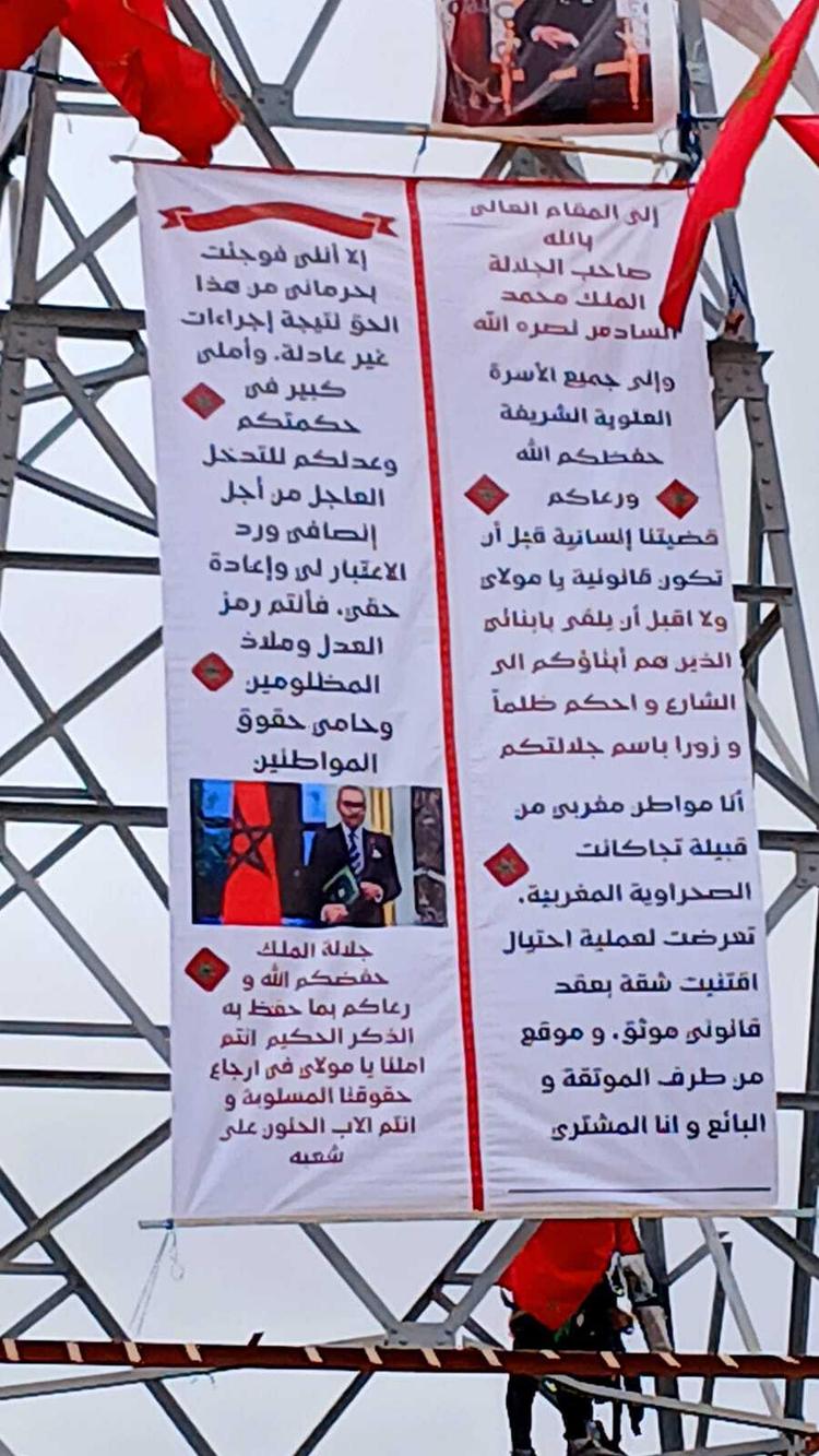ورفع المعني بالأمر لافتة موجّهة إلى جلالة الملك محمد السادس، استعرض من خلالها قضيته التي وصفها بأنها “إنسانية قبل أن تكون قانونية”، مؤكدًا أنه مواطن مغربي ينتمي إلى قبيلة “تجاكانت الصحراوية المغربية”، وأنه تعرض لما اعتبره عملية احتيال بعد اقتنائه شقة بعقد قانوني موثق وموقع من جميع الأطراف، قبل أن يُفاجأ بحرمانه من حقه نتيجة ما وصفها بإجراءات غير عادلة.