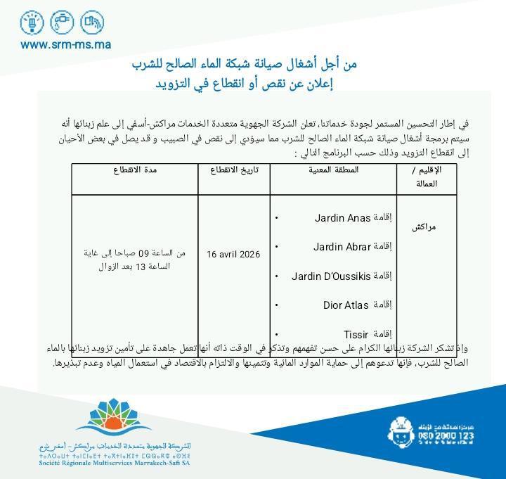 من أجل الصيانة.. انقطاع الماء عن هذه الإقامات بمراكش